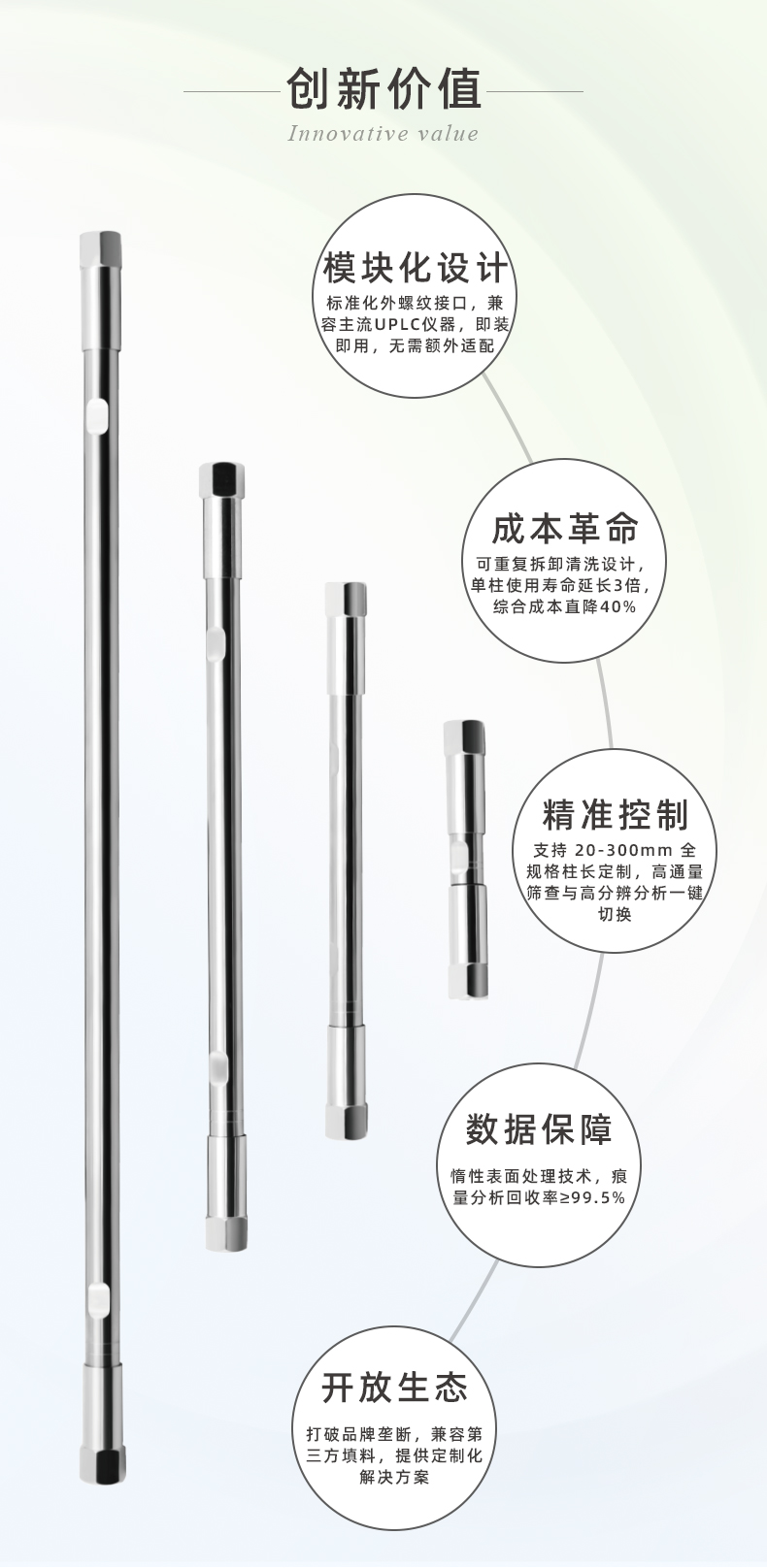 恒譜生液相色譜柱主要由不銹鋼空柱管柱頭、硅膠填料和附屬件組成。本產(chǎn)品從客戶角度出發(fā),采用了先進(jìn)的設(shè)計理念: